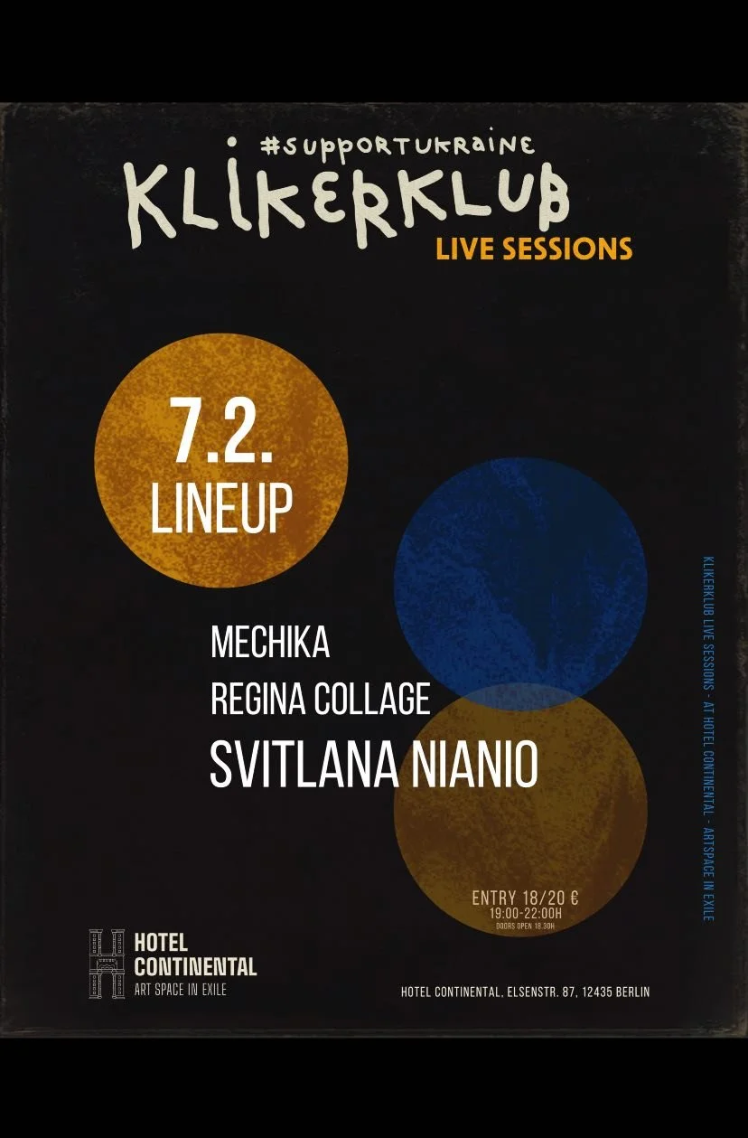 KLIKERKLUB is happy to announce the 2nd endition of “Klikerklub Live Sessions” in collaboration with “Hotel Continental – Art Space in Exile”. KLIKERKLUB presents a varied and cross-genre mix selection of Ukrainian independent musical acts live in Berlin, showcasing artists that are part of the KLIKERKLUB Podcasts and Album Releases.
