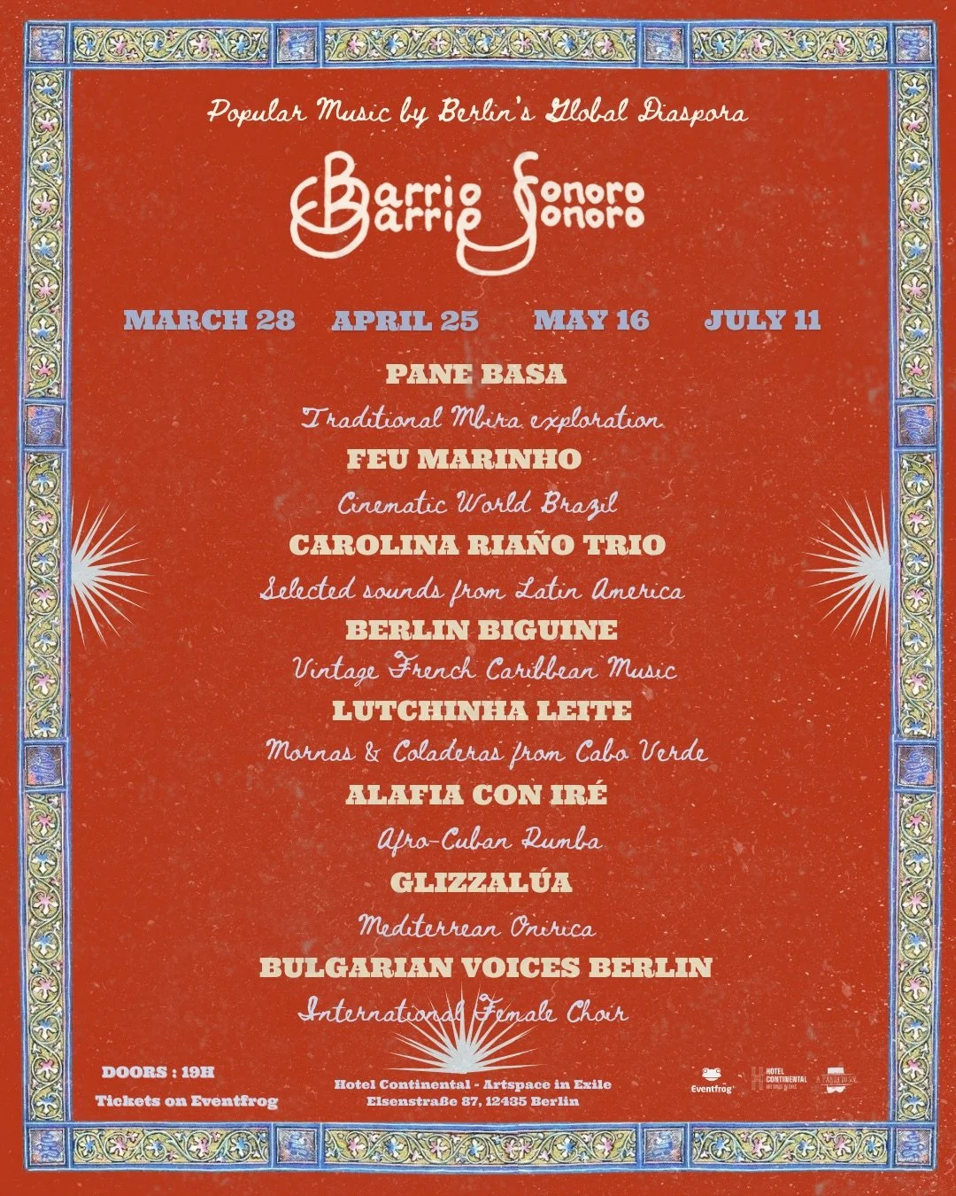 Barrio Sonoro is a new concert series in Berlin that seeks to explore and showcase the rich legacy of global popular music. Featuring artists from all corners of the world, largely based in Berlin. This season offers an in-depth look at the musical heritage of regions such as Brazil, Latin America, the Caribbean, South Africa , Cape Verde, the Mediterranean & Bulgaria. With an emphasis on popular music and the musical traditions that shape local scenes, Barrio Sonoro serves as both a forecast and a reflection of Berlin’s evolving artistic landscape.